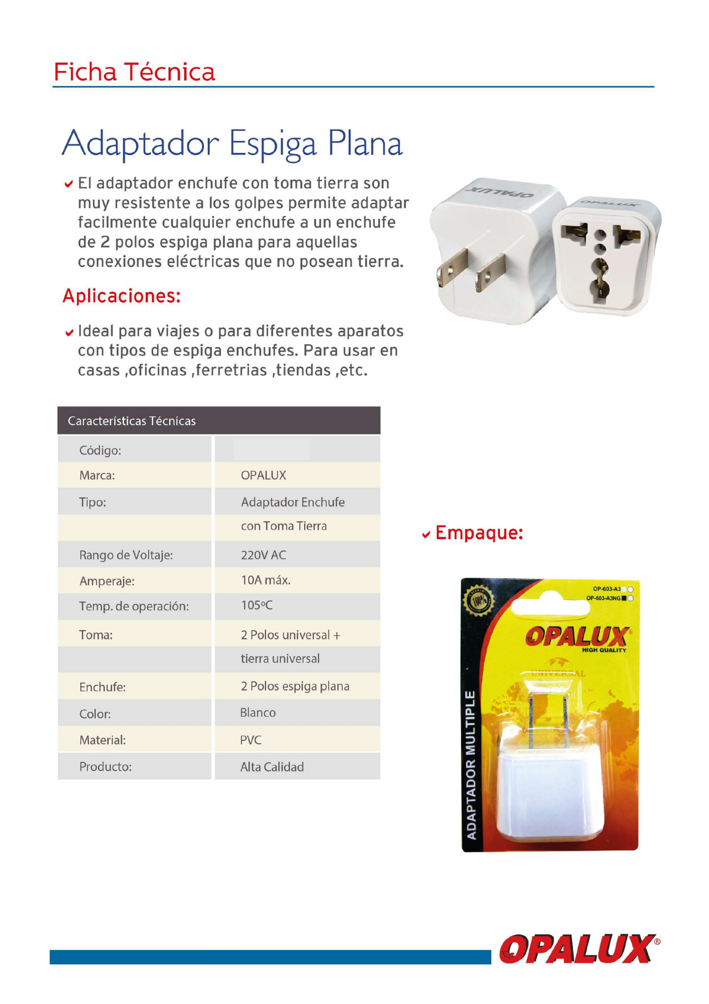 El Adaptador de Enchufe Múltiple con Espiga Plana (Modelo AP-6048) de la marca Opalux es un accesorio eléctrico diseñado para expandir un punto de conexión único en múltiples salidas de corriente. Su diseño compacto cuenta con clavijas de tipo plano (estándar americano), lo que lo hace ideal para tomacorrientes de pared donde se requiere conectar varios dispositivos de baja potencia simultáneamente sin ocupar demasiado espacio. Fabricado con materiales resistentes y seguros, ofrece una solución rápida y eficiente para organizar cables en el hogar, la oficina o durante viajes.