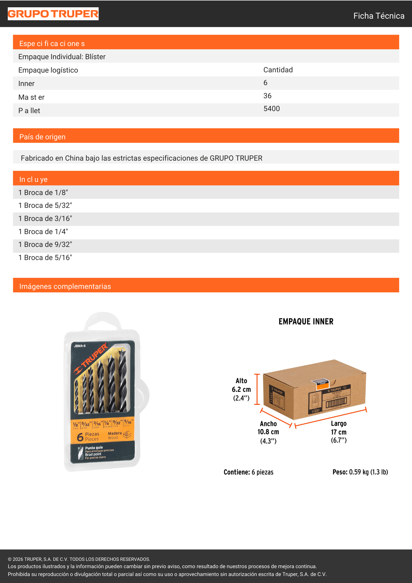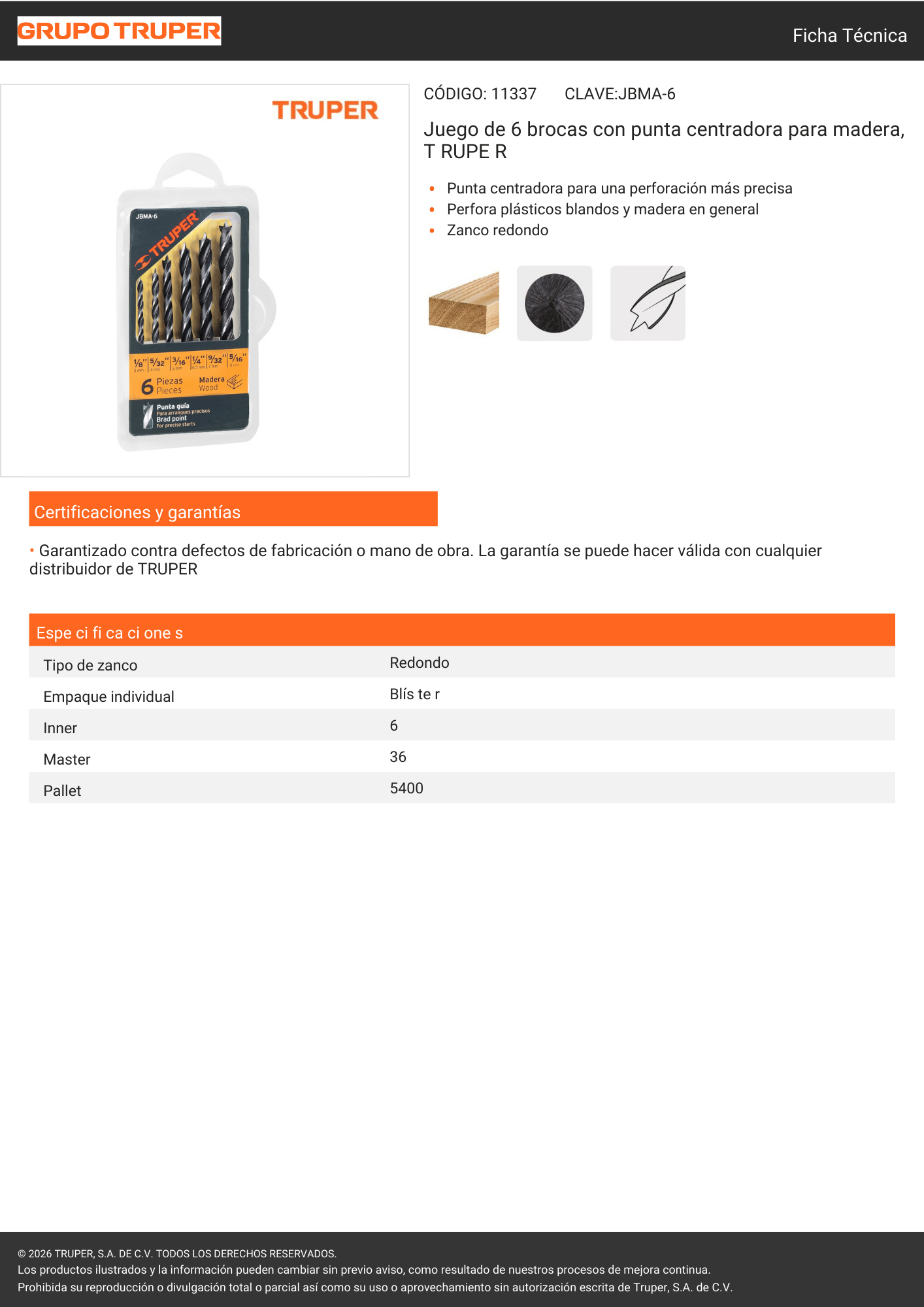 Juego de brocas para madera Truper, compuesto por 6 unidades, ideal para perforaciones limpias y precisas en madera y derivados. Fabricadas en material resistente, ofrecen buen rendimiento y durabilidad en trabajos de carpintería y uso general.