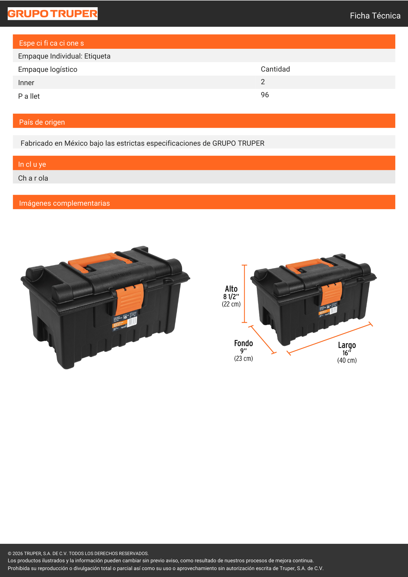 Caja de herramientas Truper de 16 pulgadas, ideal para organizar y transportar herramientas de forma práctica y segura. Fabricada en material resistente, ofrece buena capacidad, durabilidad y facilidad de uso para el hogar o taller.