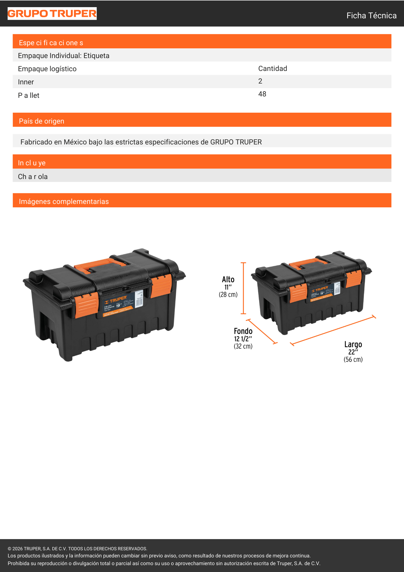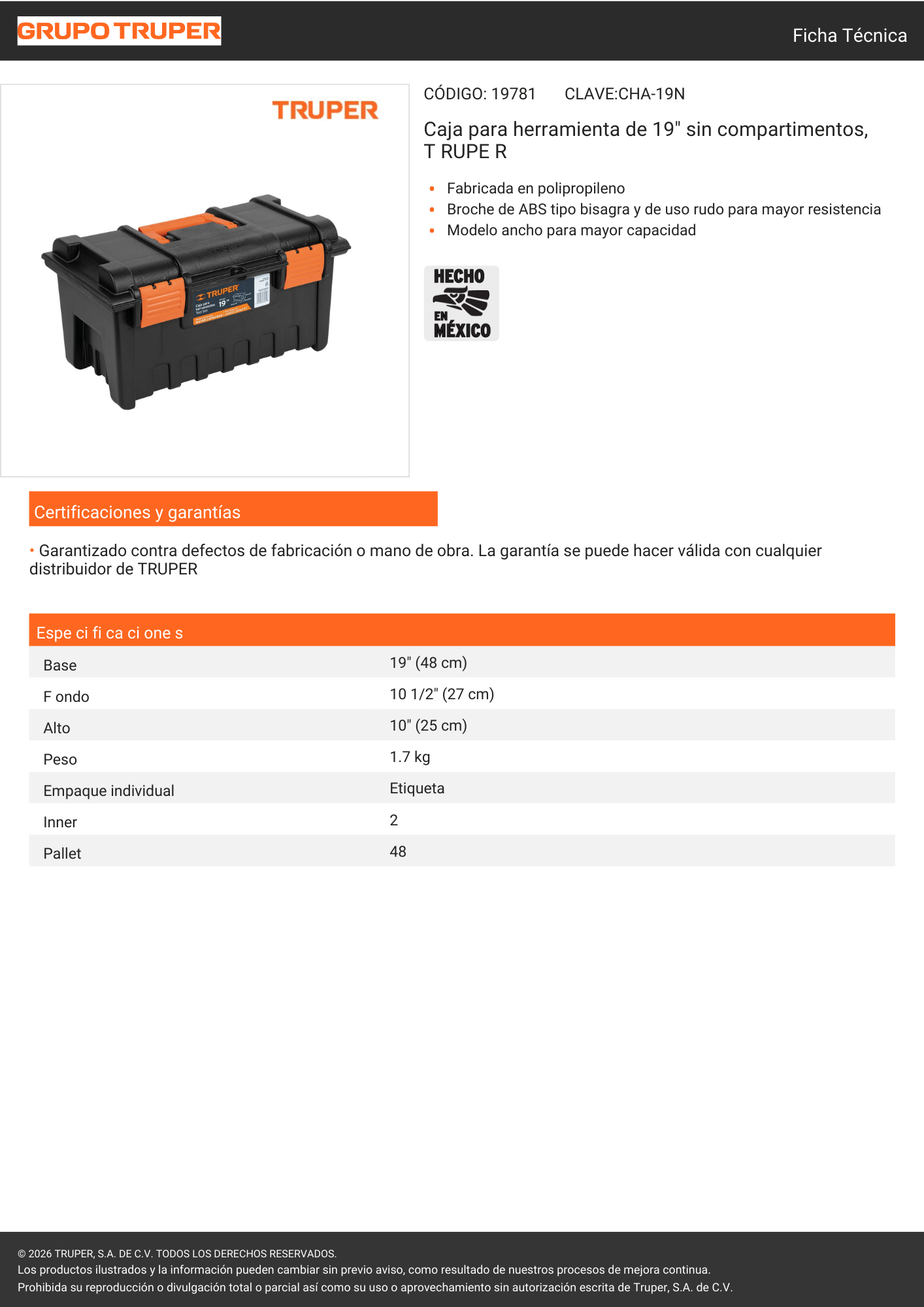 Caja de herramientas Truper de 19 pulgadas, ideal para organizar y transportar una mayor cantidad de herramientas de forma segura. Fabricada en material resistente, ofrece amplia capacidad, durabilidad y practicidad para el hogar o taller.