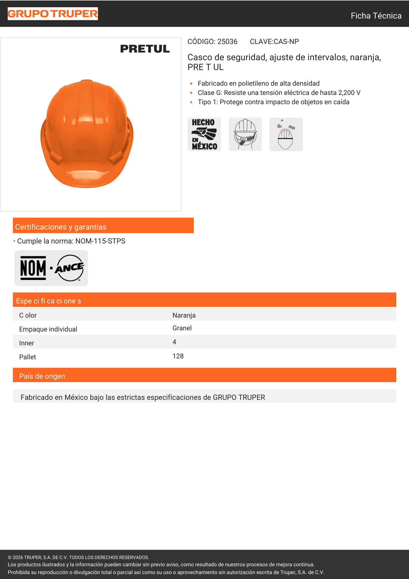 Elemento de protección personal (EPP) de la línea Pretul (marca de confianza de Truper), diseñado para ofrecer una protección confiable a un costo accesible. Este casco (modelo CAS-N) está fabricado en polietileno de alta densidad (HDPE), brindando una resistencia efectiva contra impactos y una protección dieléctrica contra tensiones de hasta 20,000 V.