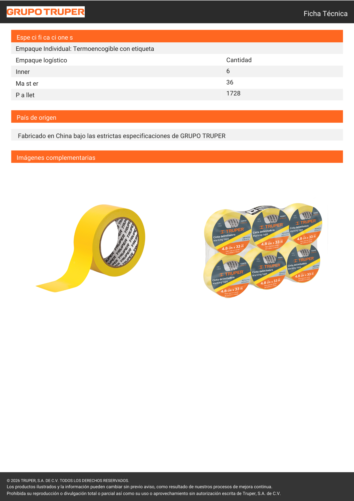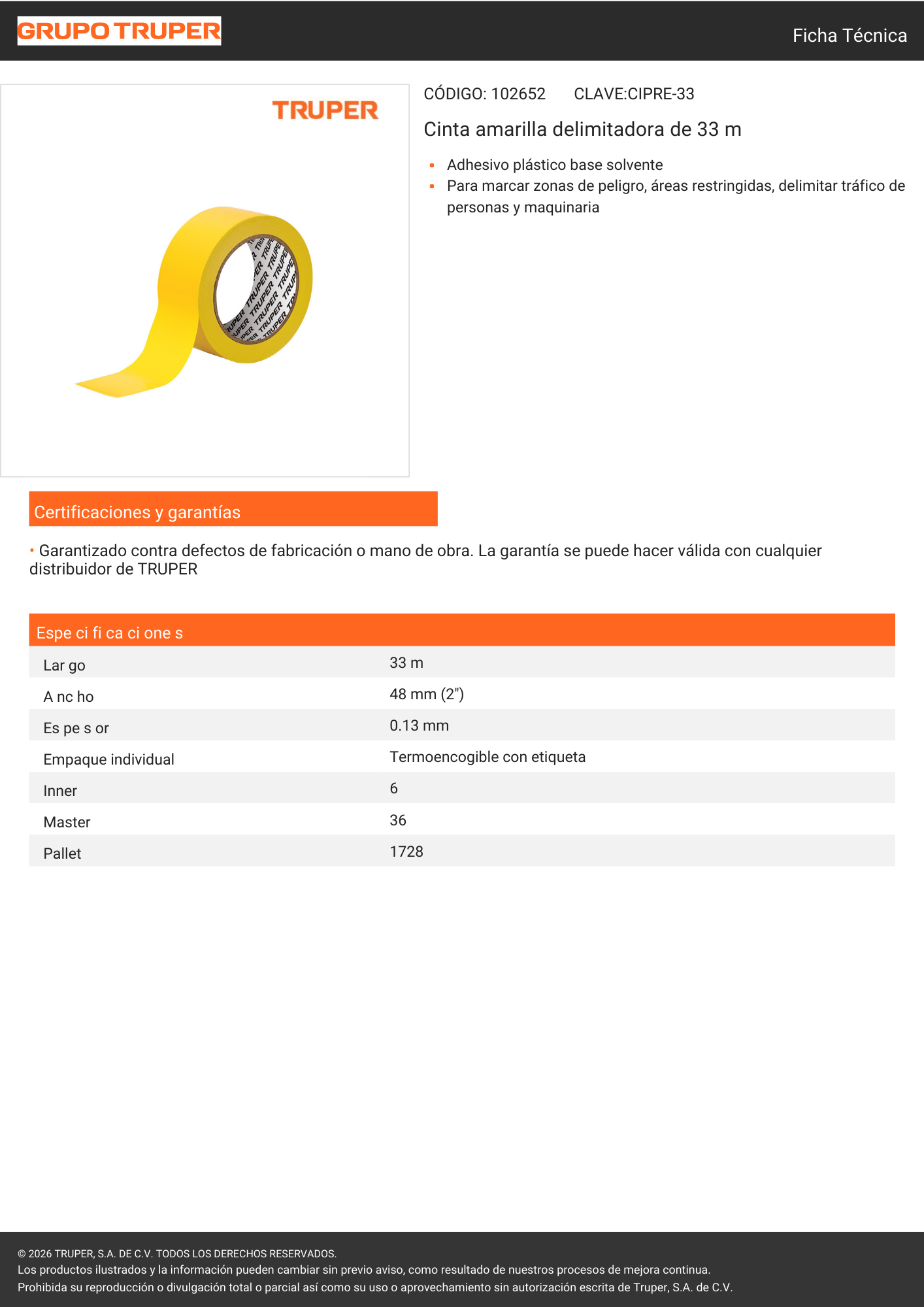 Cinta amarilla de 2 pulgadas × 33 metros, ideal para señalización, marcaje y protección en obras, talleres o áreas industriales. Su material resistente ofrece buena visibilidad y durabilidad, facilitando organización y seguridad en el espacio de trabajo.