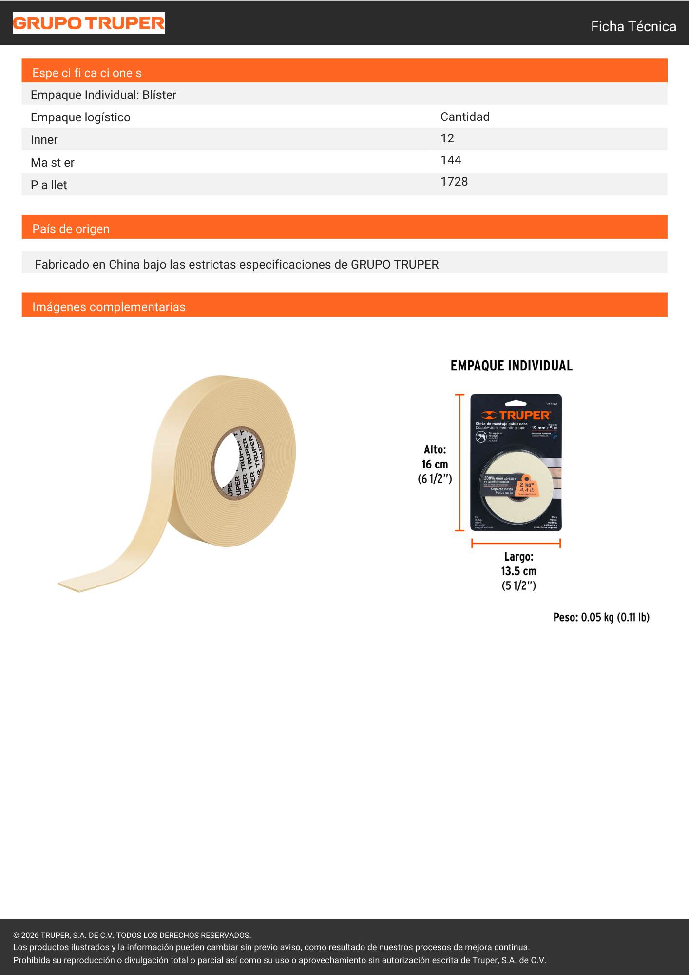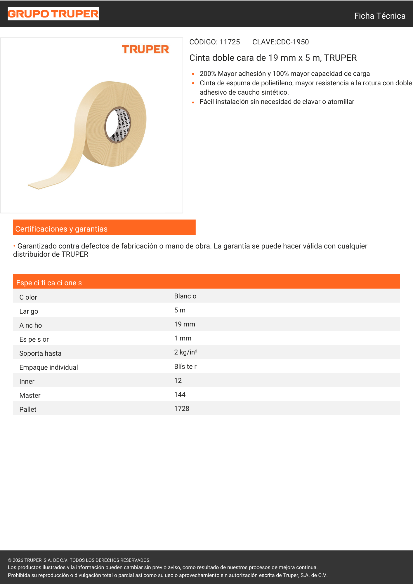 Cinta doble contacto 19mm x 5mts (11725) truper