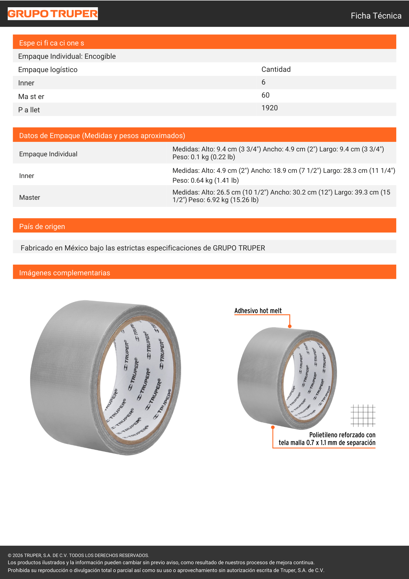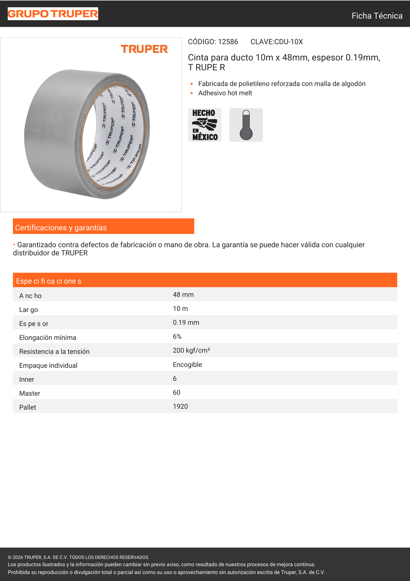 Cinta gris de ducto Truper de 0.19 mm × 10 m, ideal para sellado, reparación y refuerzo en ductos, tuberías y superficies múltiples. Ofrece alta resistencia, buena adhesión y durabilidad, siendo una opción confiable para trabajos en talleres, hogares o zonas industriales.