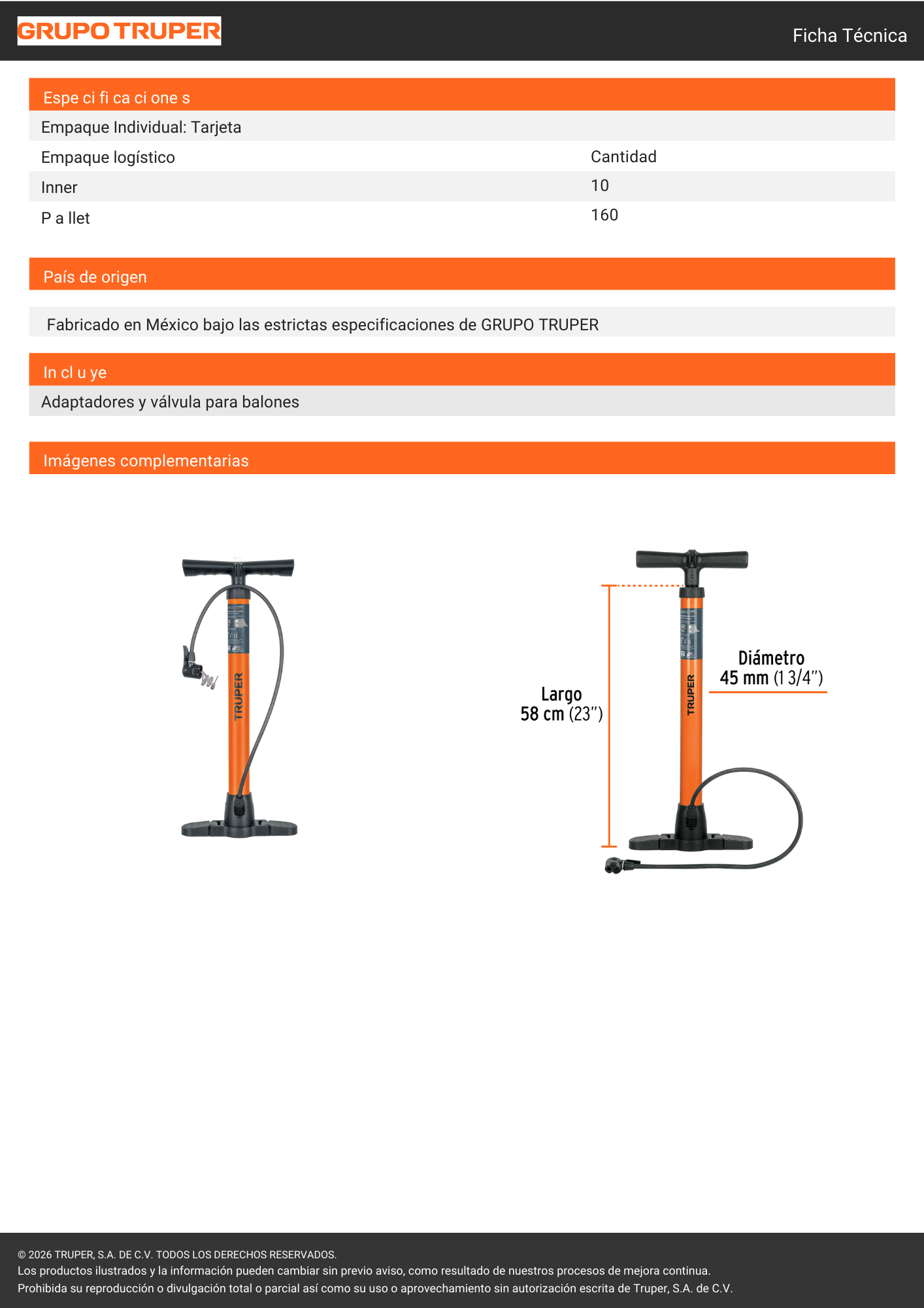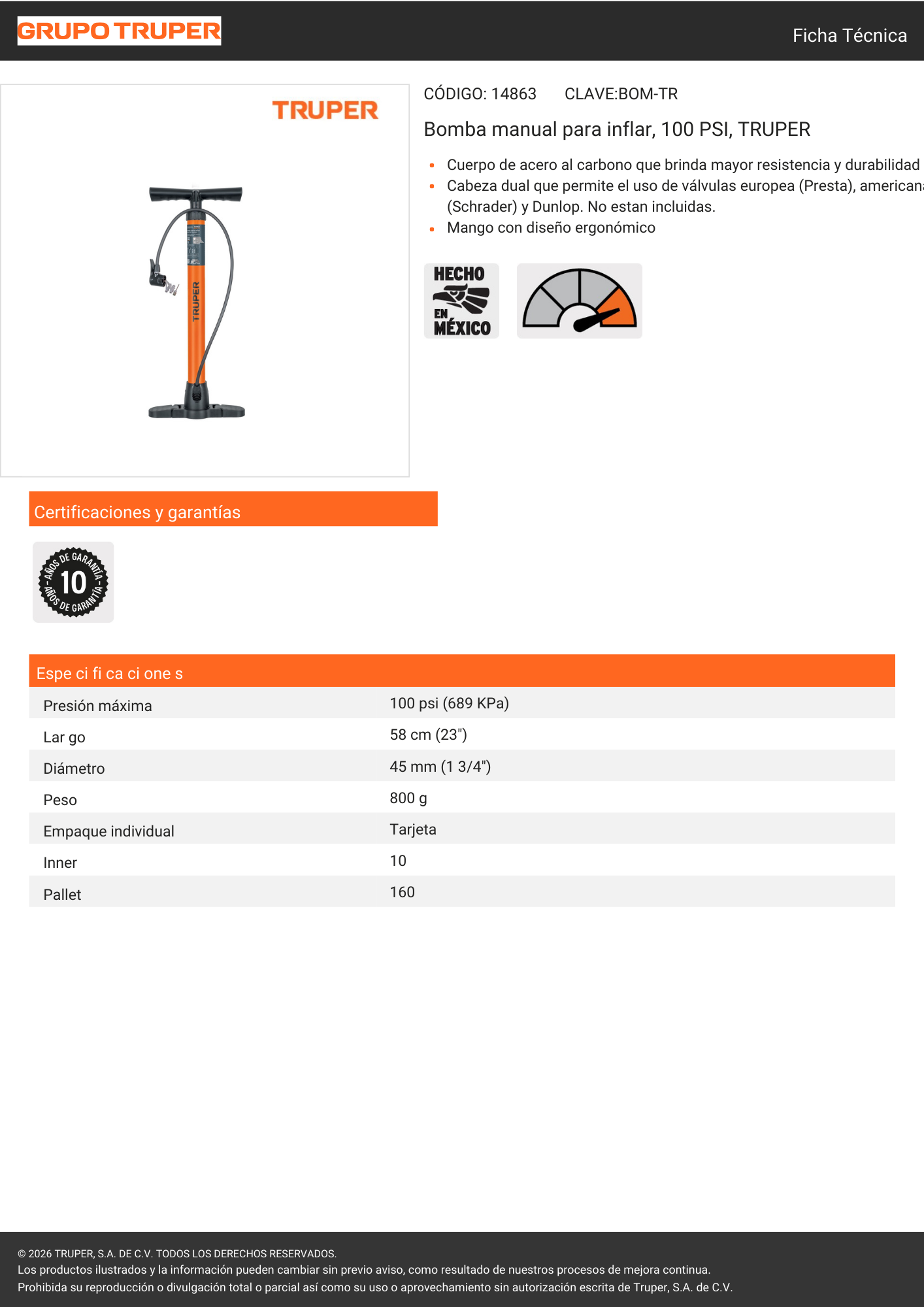 Inflador de Aire Truper 100 PSI (modelo 14863), de uso profesional y doméstico, ideal para inflar neumáticos de bicicletas, motocicletas y balones. Cuenta con un cilindro de acero de alta resistencia y una base amplia para mayor estabilidad, garantizando un inflado rápido, eficiente y con el mínimo esfuerzo.