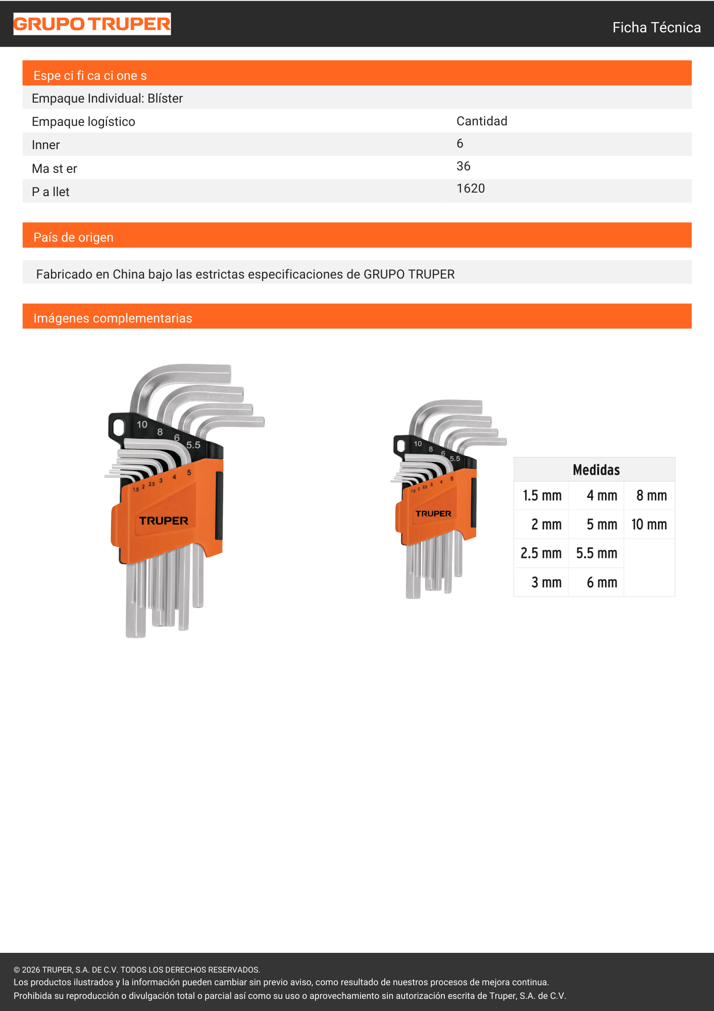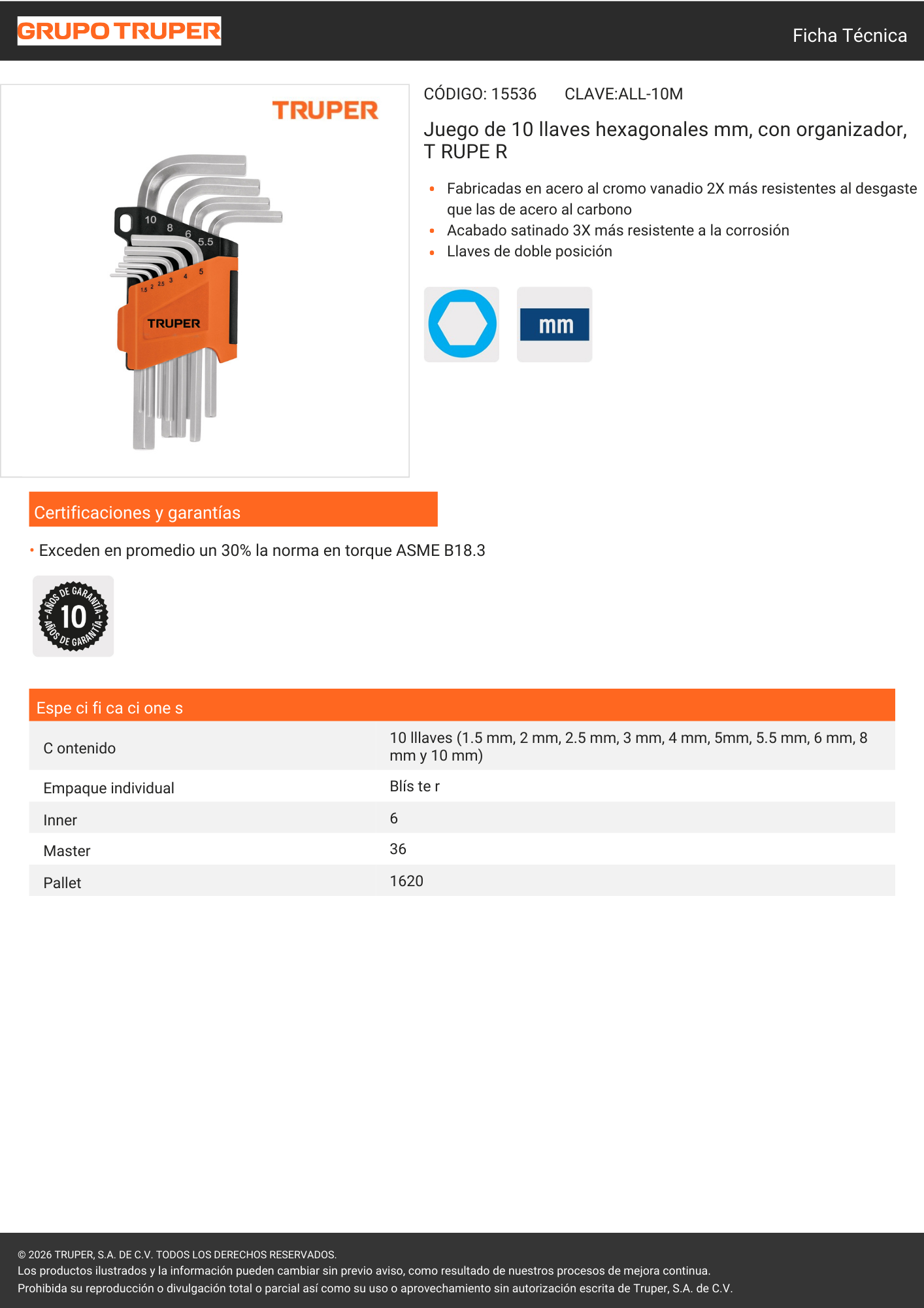 Juego llaves allen milimetrico x 10 und (15536) truper