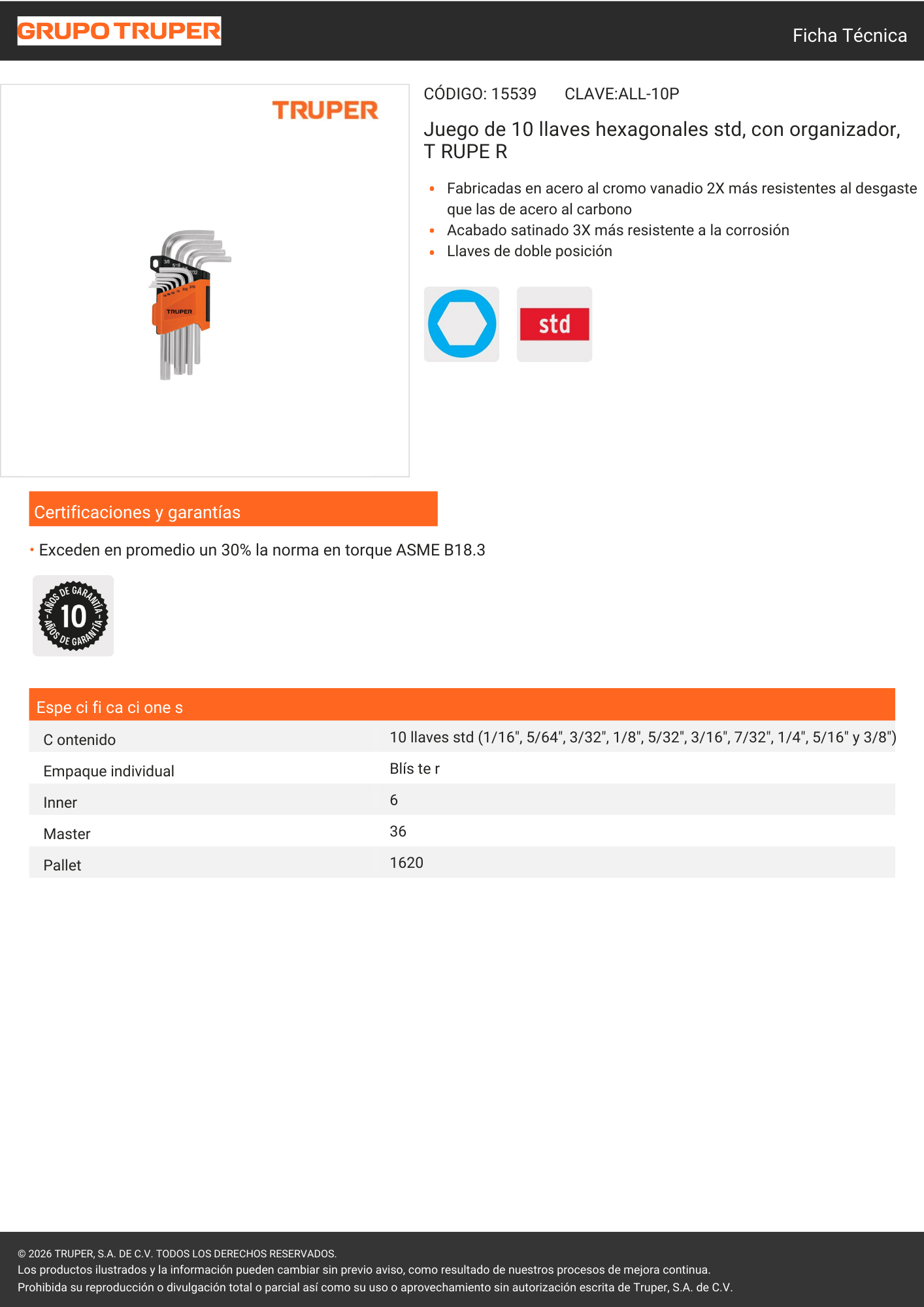 Juego llaves allen standar x 10 und (15539) truper