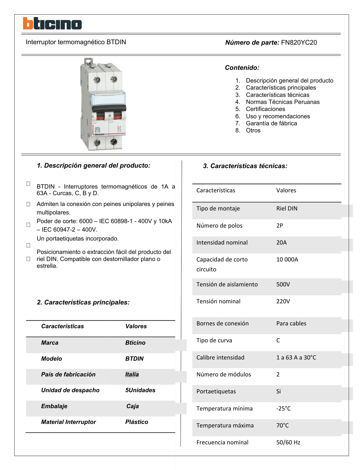 La Llave Térmica Monofásica (2 x 20A) para montaje en Riel DIN de la marca Bticino es un interruptor termomagnético esencial para la protección de instalaciones eléctricas residenciales o comerciales. Su capacidad de 20 Amperios es la medida estándar recomendada para circuitos de tomacorrientes generales, protegiendo el cableado contra sobrecalentamientos por exceso de carga y cortocircuitos.
