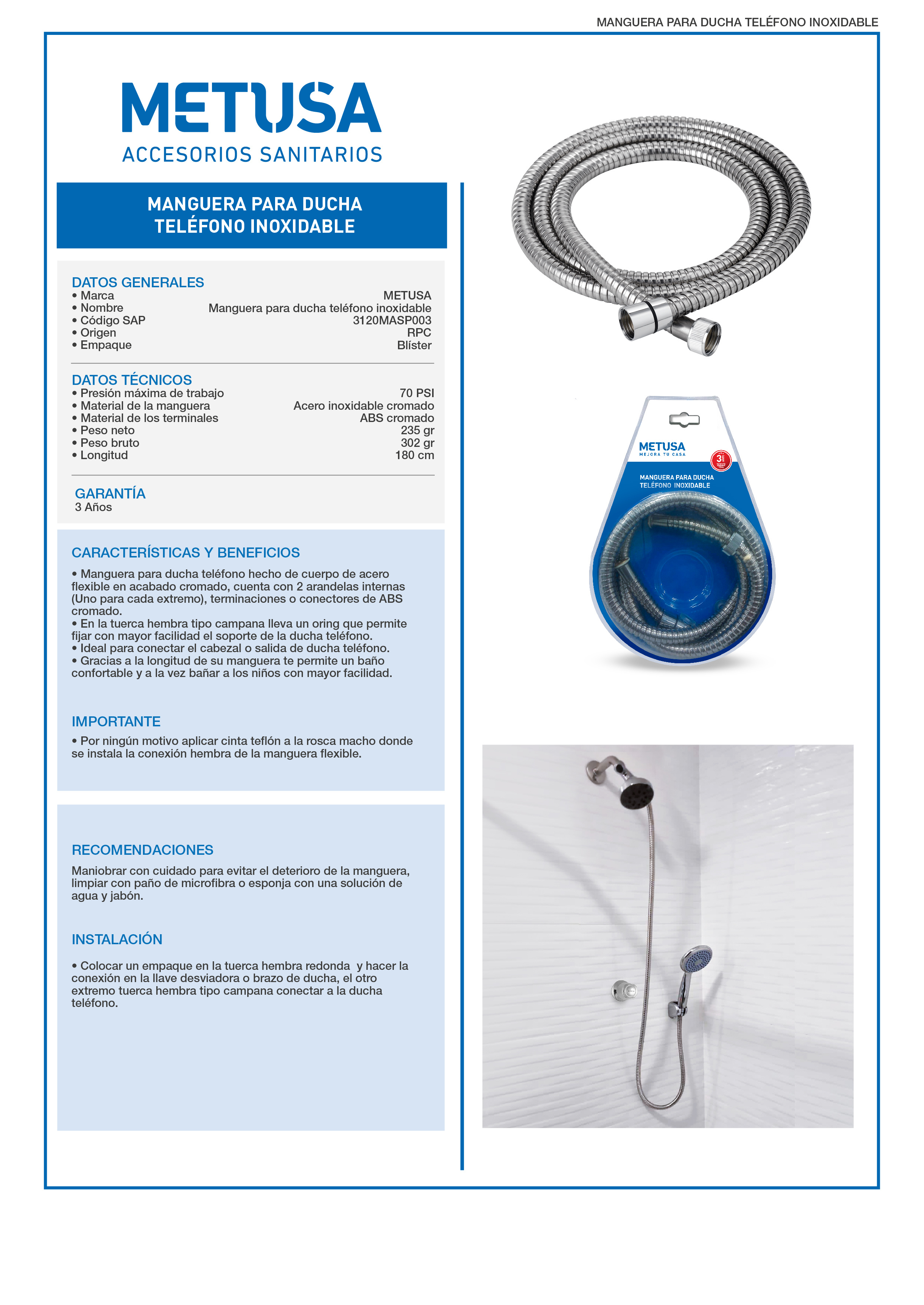 Manguera para Ducha Teléfono Metusa (modelo P0003), de uso doméstico y hotelero. Fabricada en material flexible de alta durabilidad con acabado cromado, está diseñada para resistir la presión de agua y variaciones de temperatura. Cuenta con terminales universales que facilitan una instalación rápida y sin fugas en cualquier mango de ducha estándar.