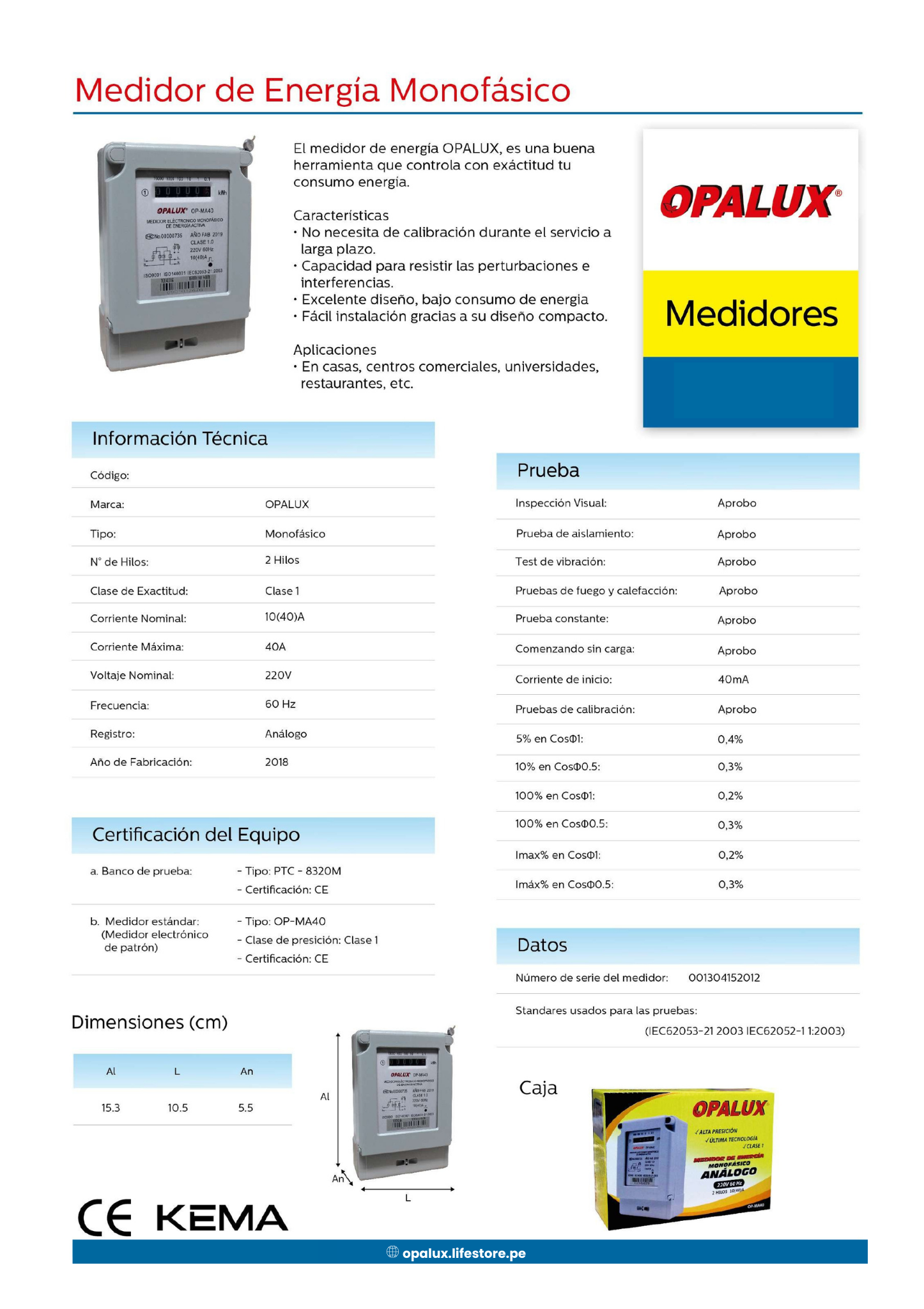 Medidor Analógico Monofásico Opalux (modelo OP-MA40), de uso doméstico y comercial. Diseñado para el control de consumo eléctrico interno, este medidor de energía cuenta con una pantalla de lectura numérica mecánica de alta precisión. Es ideal para submediciones en departamentos, habitaciones de alquiler o talleres, permitiendo un seguimiento claro del gasto de kilovatios-hora ($kWh$).