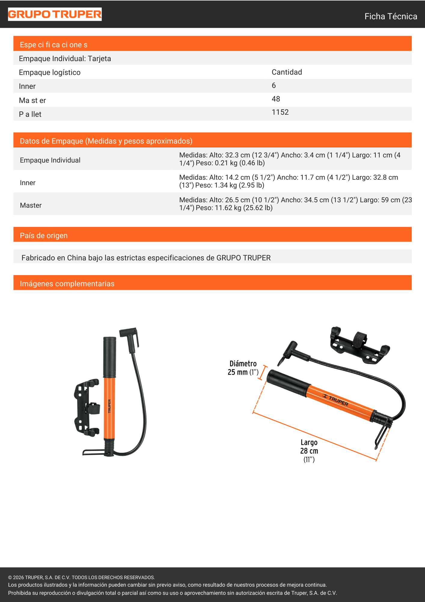 Mini Inflador de Aire Truper (modelo 13790), de uso doméstico y deportivo. Es una herramienta compacta y portátil, ideal para inflar neumáticos de bicicletas, balones y artículos inflables de forma rápida. Cuenta con un cuerpo de aluminio ligero pero resistente, una base plegable para mayor estabilidad durante el uso y un cabezal dual compatible con válvulas tipo Schrader (auto) y Presta (bicicleta de ruta).