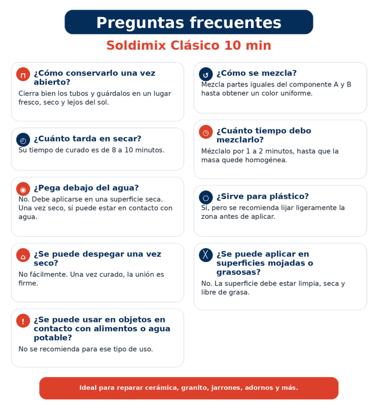 Soldimix Clásico 10 min. es un pegamento epóxico de 30 g de acción rápida, ideal para reparar y unir adornos, estatuillas, jarrones, zócalos, cerámicos y granito. Su fórmula de dos componentes ofrece un tiempo de curado de 8 a 10 minutos, color marfil y soporte de temperatura de hasta 100 °C. Incluye tubos A y B, tablita roja y espátula mezcladora para una aplicación práctica y precisa.