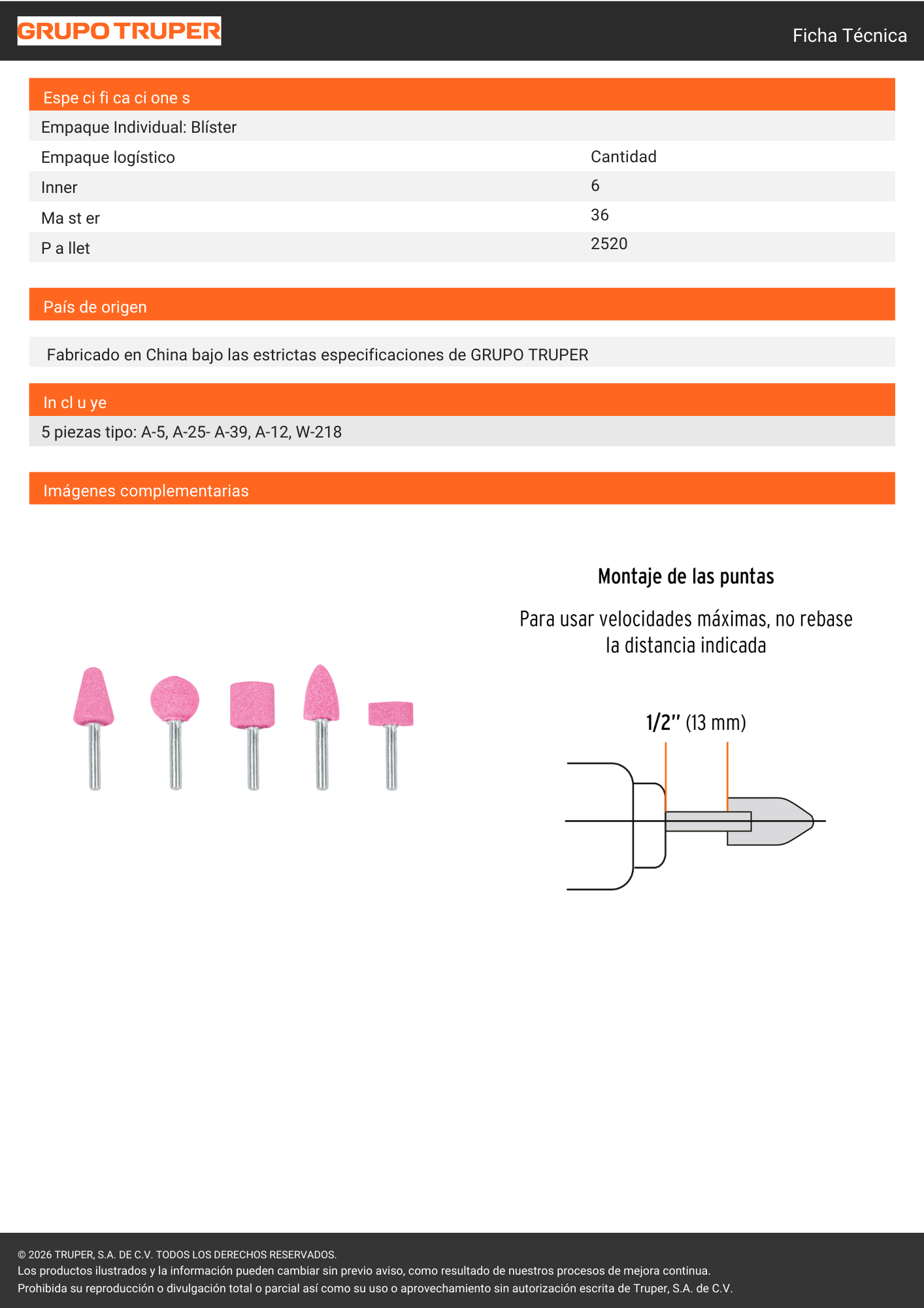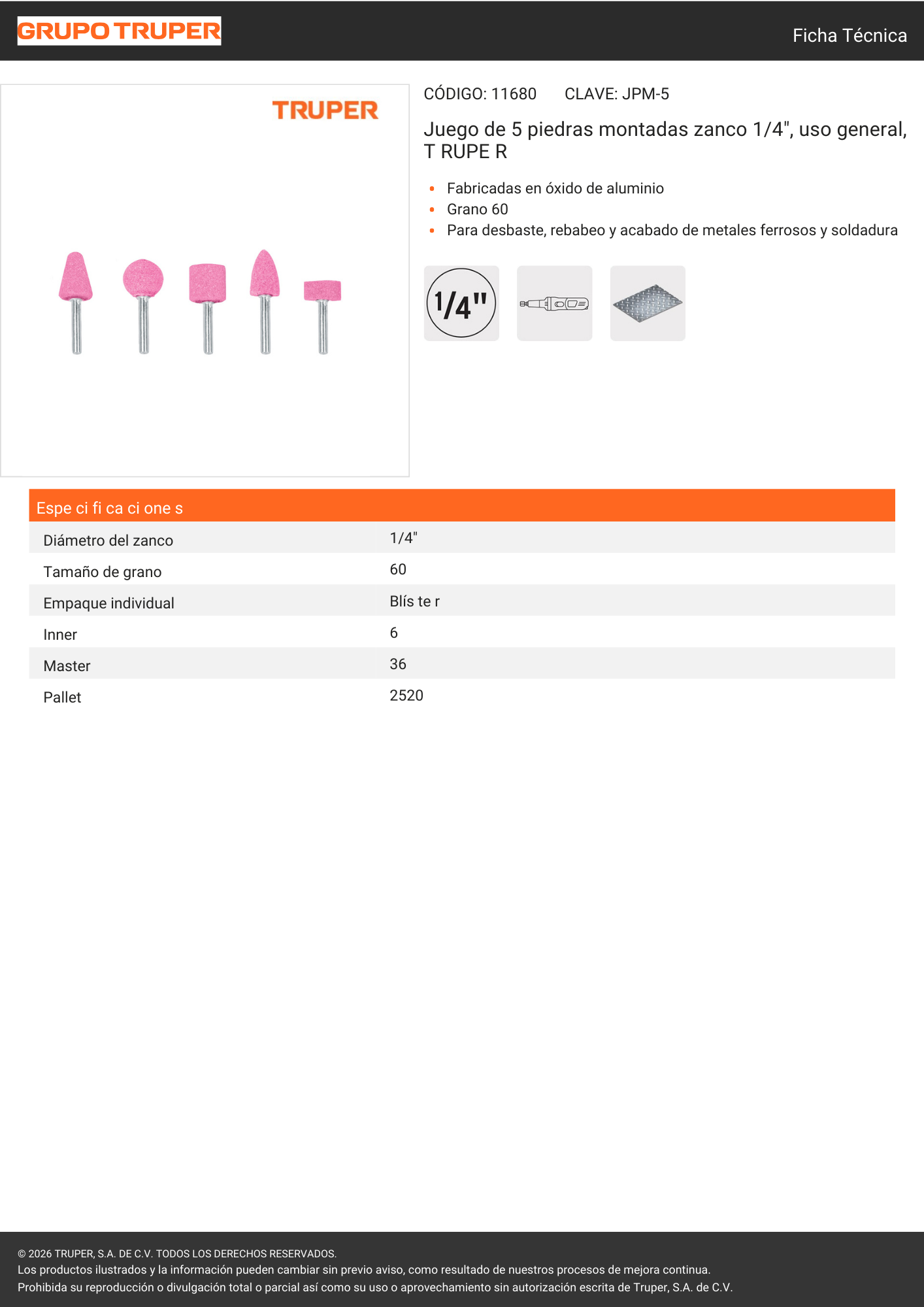 Juego de Piedras para Taladro x 5 unidades (Fresa) de la marca Truper (código 11680). Este kit incluye puntas montadas fabricadas en óxido de aluminio de alta resistencia, diseñadas con diferentes formas (cilíndricas, esféricas y cónicas) para adaptarse a diversos tipos de acabados. Son ideales para el esmerilado, desbaste y pulido de metales, piezas fundidas o soldaduras, garantizando un trabajo preciso y eficiente al ser utilizadas con taladros eléctricos o mototool.