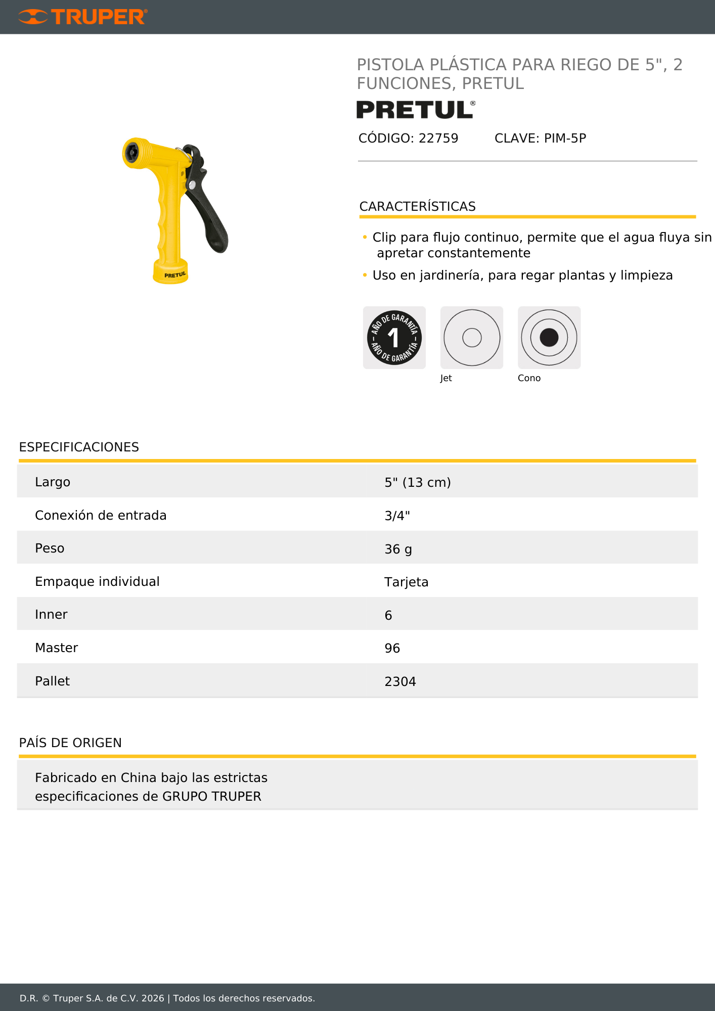 La Regadera de PVC de la marca Pretul (código 22759) es una opción económica y funcional para tu baño. Está fabricada en PVC de alta resistencia, lo que la hace inmune a la corrosión y a la acumulación de sarro, ideal para zonas con agua "dura". Su diseño circular está pensado para ofrecer un chorro uniforme y confortable, siendo muy fácil de instalar gracias a su entrada estándar de 1/2".
