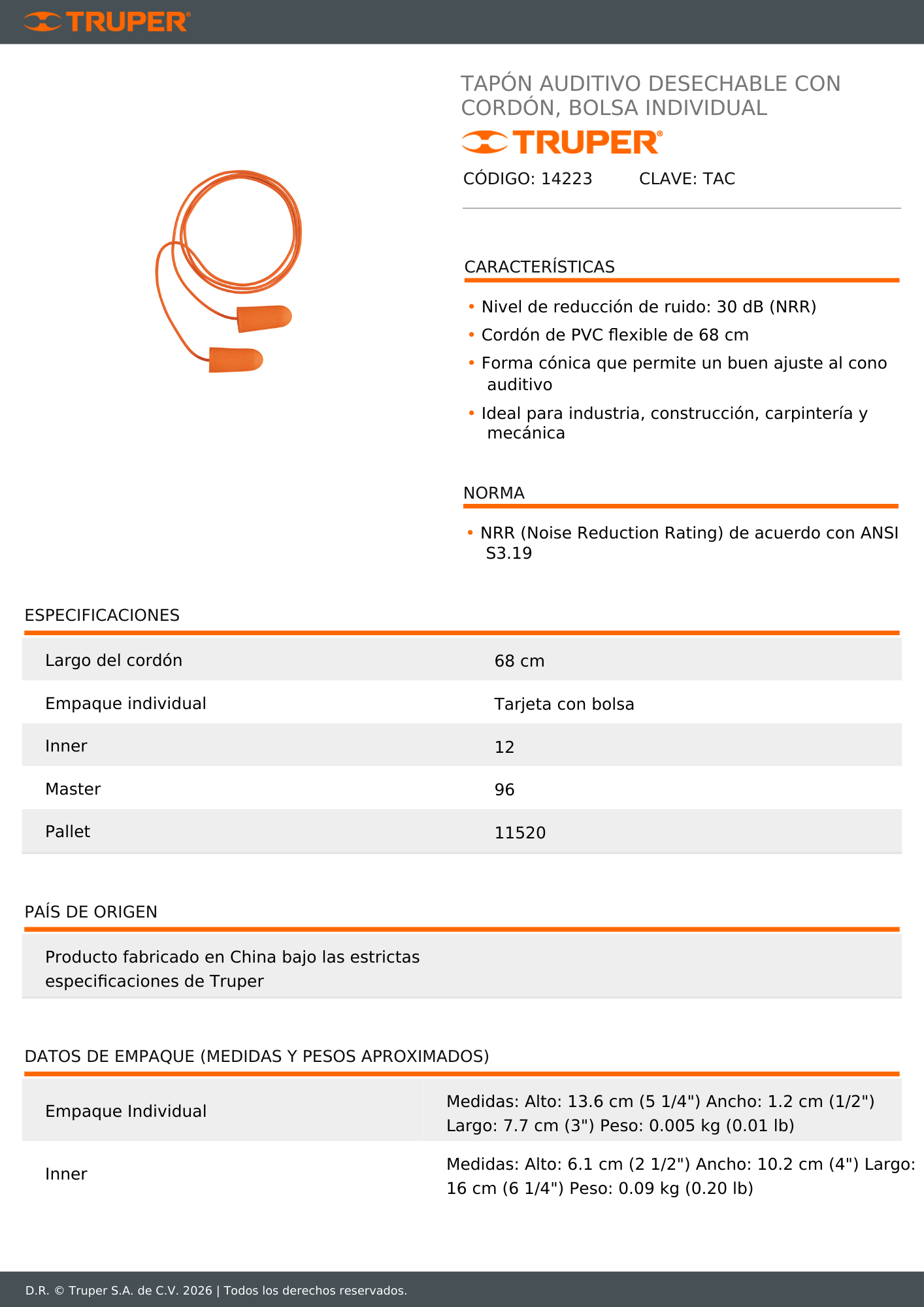 Tapon de oido desechable (14223) truper