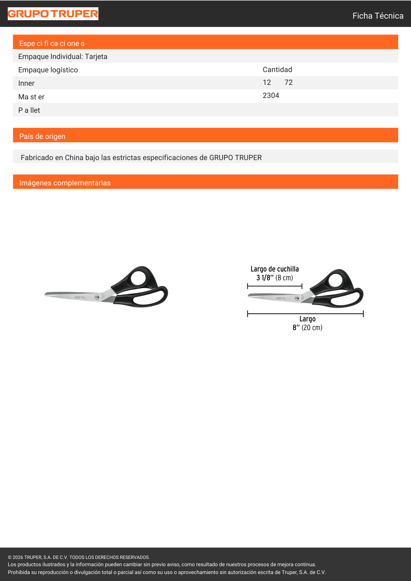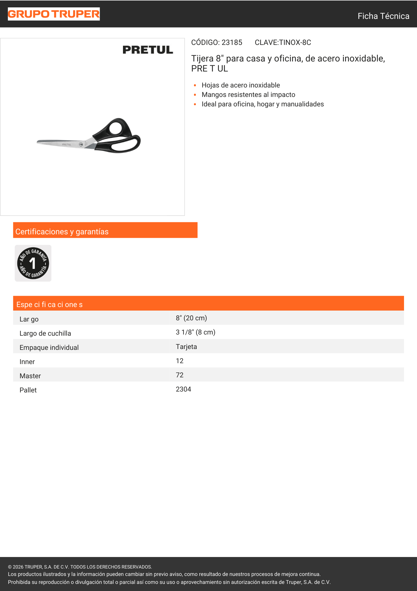 La Tijera de Oficina de 8 pulgadas (Modelo 23185) de la marca Pretul es una herramienta de corte versátil y resistente, diseñada específicamente para el uso diario en entornos de oficina, hogar y tareas escolares. Fabricada con hojas de acero inoxidable que mantienen su filo por más tiempo, su diseño ergonómico con mangos de plástico de alto impacto permite realizar cortes precisos y cómodos en papel, cartulina, cintas adhesivas y otros materiales ligeros de papelería, garantizando una experiencia de uso suave y eficiente. Con una longitud total de 20 cm (8''), esta tijera ofrece el tamaño ideal para un control total sobre el trazo, siendo el complemento perfecto para organizar tus documentos o realizar manualidades con un acabado limpio y profesional.