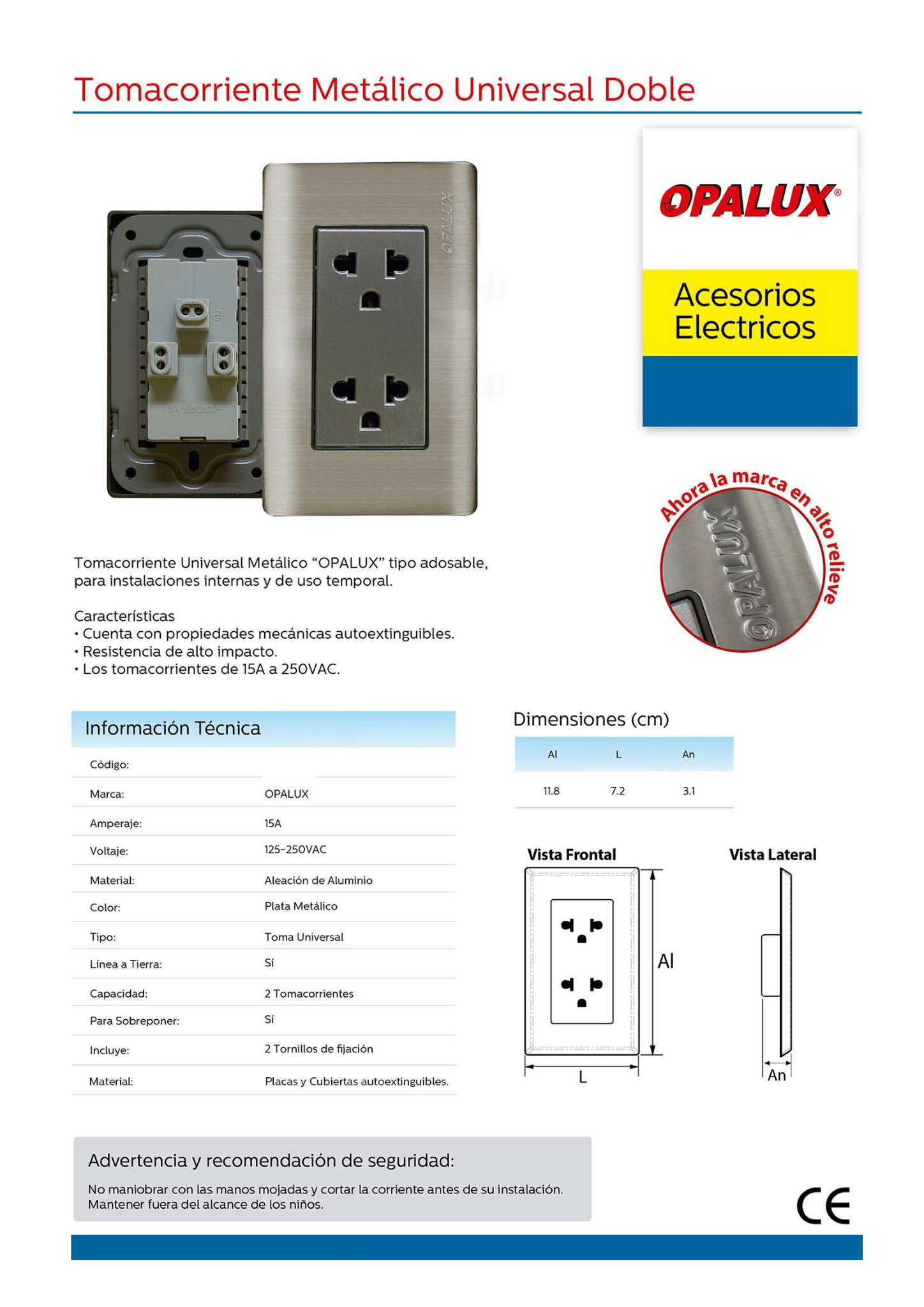 Mecanismo de alta gama diseñado para ofrecer máxima seguridad y durabilidad. Este tomacorriente de la línea Opalux cuenta con dos puntos de conexión y toma de tierra (3 polos), fundamental para proteger equipos electrónicos sensibles. Su característica distintiva es su acabado con placa metálica, que le otorga una resistencia superior a impactos y un diseño moderno y minimalista ideal para oficinas, cocinas o áreas de alto tránsito.