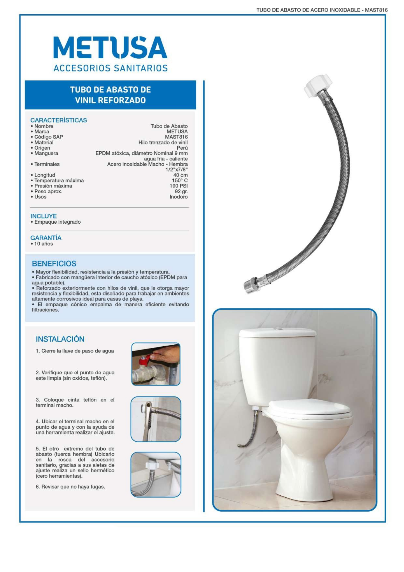El Tubo de Abasto de 7/8" de la marca Metusa es un conector flexible de alta calidad diseñado específicamente para el suministro de agua en inodoros. Su trenzado en acero inoxidable y terminales reforzados garantizan una conexión hermética, gran resistencia a la presión y protección total contra la corrosión.